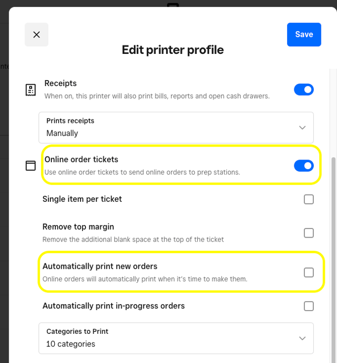 - Scroll down to Online order tickets & toggle this on