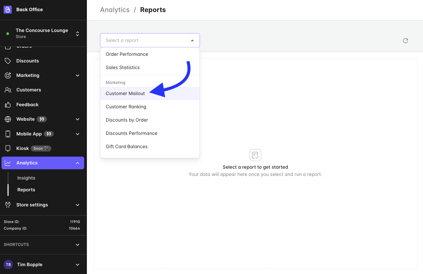 Once the report has been run for the selected date, the report will generate a list of users including customer name, email, and order totals. You can export this data into either Excel format, a PDF, or CSV